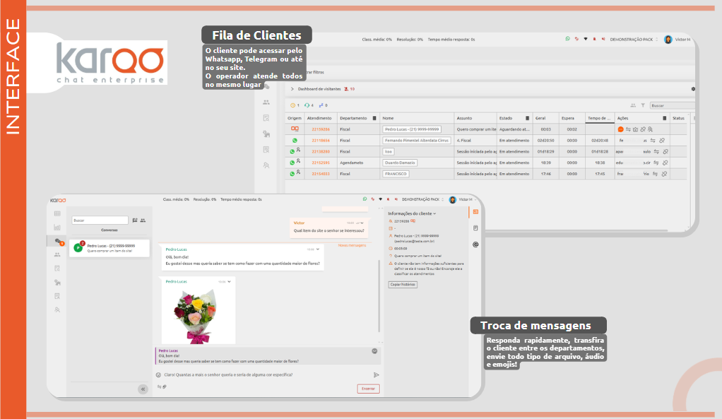 Comunicação completa e dinâmica: responda rapidamente, transfira clientes entre departamentos, e utilize diversos formatos de mídia (arquivos, áudio e emojis). |