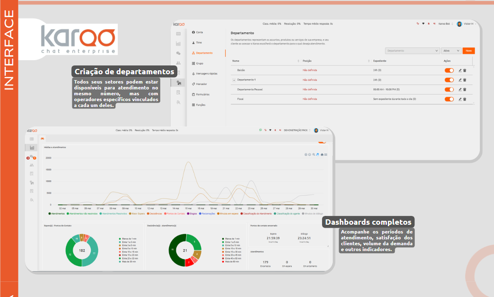Painéis completos para monitorar métricas essenciais como períodos de atendimento, índice de satisfação do cliente e volume de demanda. |